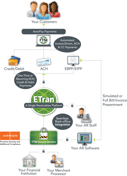 FTNI's ETran AutoPay solutions support the automatic acceptance, processing and posting of all ACH and credit card payments across your customer base from a single, secure platform. Along with the unique benefit of utilizing a highly-configurable, automatic bill pay process, AutoPay delivers your internal accounts receivable (A/R) team with the ability to create specific business rules and workflows on a customer-by-customer basis.
