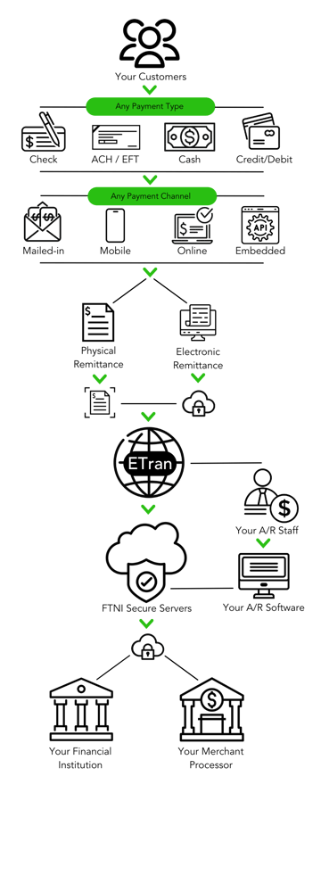 ETran is a flexible, cloud-based, integrated receivables processing platform ideal for businesses with one or many locations, payment channels, divisions or brands.