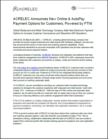 “At ACRELEC, we are committed to providing our customers with innovative technology solutions to reimagine the customer experience with restaurant and retail brands,” said Collin O’Neill, CFO - Americas of ACRELEC. “With the help of FTNI’s online and automatic debit solutions, we are able to provide our customers with an easier way to pay so they can continue to focus on improving efficiency and customer engagement within their businesses.”