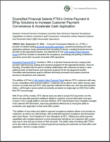 OMAHA, Neb. September 27, 2022 — Financial Transmission Network, Inc. (FTNI), a provider of industry-leading accounts receivable automation, payment processing and cash application solutions, today announced that Diversified Financial, a leading financial services provider for the agricultural industry, has selected its ETran Fully-hosted Online Payment Portal and EPay modules to streamline the acceptance, processing and posting of electronic payments across their accounts receivable (A/R) operations.