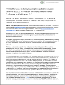 “FTNI is excited to be back onsite at this year’s AFP conference to connect with customers, partners and prospects, and share how our truly integrated receivables solutions are modernizing A/R operations for leading organizations in many industries,” said Zac Robinson, senior vice president, FTNI. “Despite the exciting growth the market has seen in the adoption of digital payments, it’s important to remember that checks are still a vital piece of many businesses’ A/R processes. But checks are increasingly changing channels from traditional back-office scanning and electronic deposit via desktop Remote Deposit Capture (RDC), to the capture of checks in the field via mobile RDC. Being able to efficiently accept, process and post check payments, along with the addition of convenient digital payment options—all on a single platform—is where truly integrated receivables platforms separate themselves from dashboard driven systems to help businesses maximize A/R operational efficiencies and cost savings.”