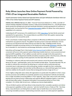 OMAHA, Neb. (PRWeb) February 27, 2018 – Financial Transmission Network Inc. (FTNI), a provider of industry-leading integrated receivables solutions, today announced Ruby Wines Inc., a fourth generation family owned and operated wine and spirit wholesale distributor serving a growing list of customers in Massachusetts, has launched its ETran Integrated Receivables platform to deliver new online payment capabilities to its customers.