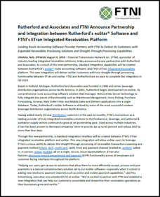 OMAHA, Neb. (PRWeb) August 9, 2018 – Financial Transmission Network Inc. (FTNI), a provider of industry-leading integrated receivables solutions, today announced a new partnership with Rutherford and Associates. As a result of this new partnership, standard integration capabilities will be created between Rutherford’s eoStar® route accounting software, and FTNI’s ETran Integrated Receivables platform. This new integration will deliver eoStar customers with true straight-through processing functionality between ETran and eoStar. FTNI and Rutherford are on pace to complete the integration in Q3 2018.