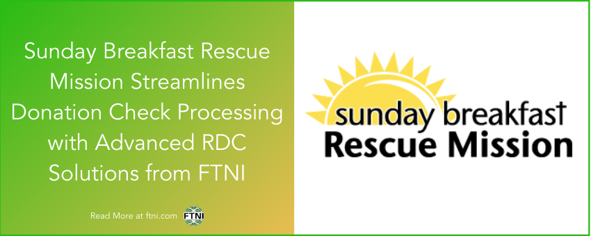 “FTNI has a proven history helping leading non-profit organizations modernize and accelerate the acceptance, processing and posting of donation transactions,” said John Karhoff, director of sales, FTNI. “We’re proud to be able to partner with Sunday Breakfast Rescue Mission to deliver game-changing RDC and back-office posting solutions to help streamline mission-critical donation processing operations within their organization.”